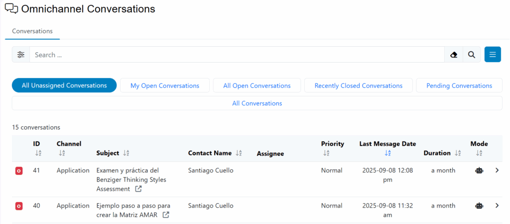 The Omnichannel Conversations allows administrators and support agents to manage all user interactions within the platform. Through this interface, users can view, filter, and manage conversations handled by AI, manual agents, or moderated modes.