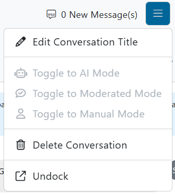 - Toggle Mode: Provides options to switch the conversation’s handling mode between AI Mode, Moderated Mode, and Manual Mode