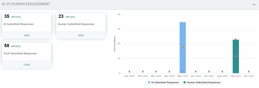 - Bar Chart: Provides a monthly breakdown of AI-submitted responses versus human-submitted responses.