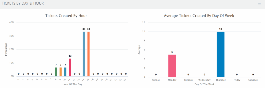 - Tickets Created By Hour: A bar chart displays the percentage of tickets created during each hour of the day.