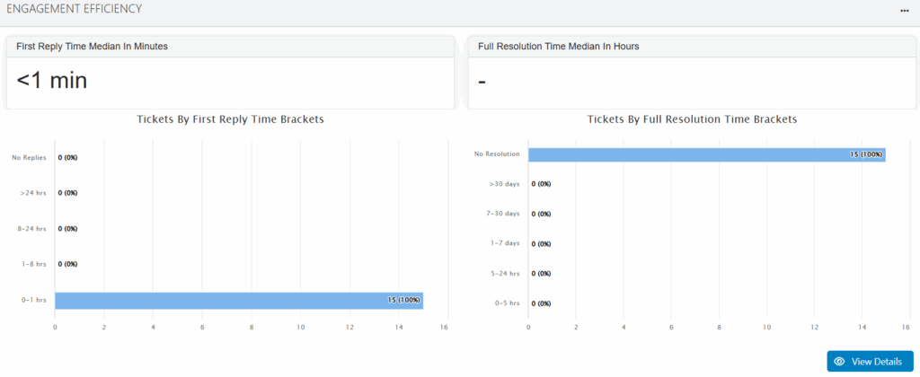 - Time Brackets: Bar charts provide a percentage breakdown of tickets based on how long they took to receive a first reply (e.g., 0-1 hrs) and to reach full resolution.