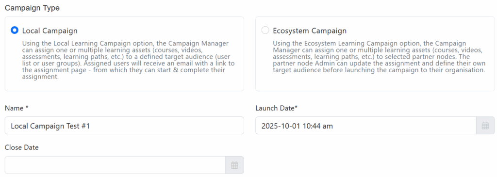 - Campaign Type: Choose Local Campaign from the drop-down menu (this option allows you to assign a bunch of learning assets to a group of users, and track progress/completion).