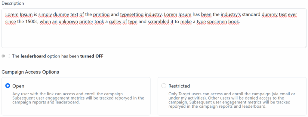 Open: Any user with the link can access and enroll the campaign.