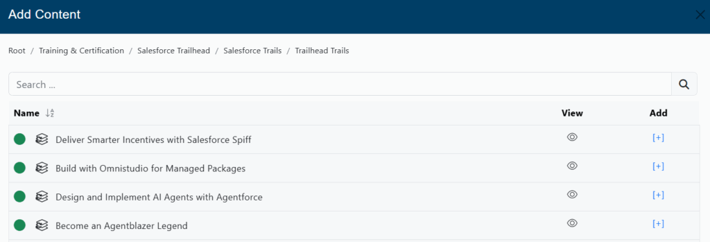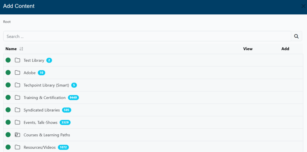 You can navigate through all the available libraries. Also, you can find any content using the Search Bar. Click on the plus [ + ] button to add content one by one or click on the + Add All button to add all the available content.