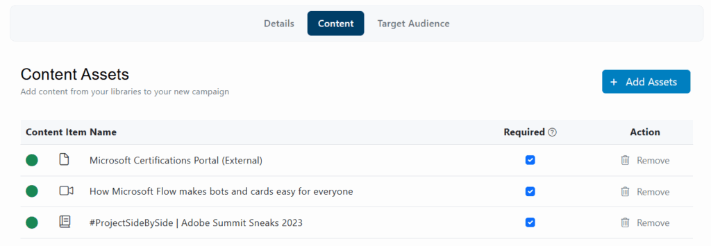 After adding one or multiple assets, close the window. You will see the list of campaign assets; you can define if the content is required or not (only required assets will be considered for the completion of the assignment). You can also remove any asset if necessary, by clicking the remove button [-].