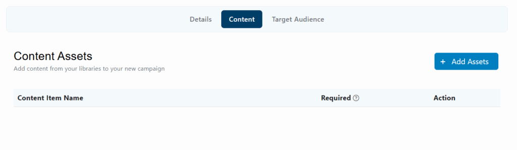 Click on the + Add Assets button and select the type of content you want to add to the campaign (For this example, we will add Content Items).