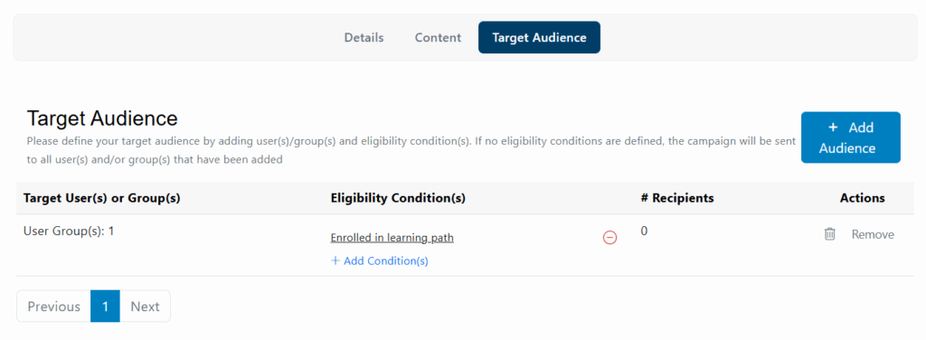 After clicking on the Save button two new tabs will appear Content and Target Audience.