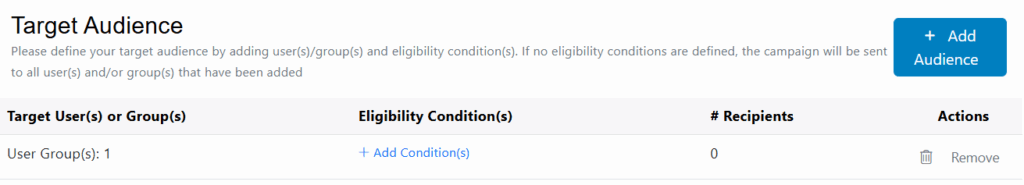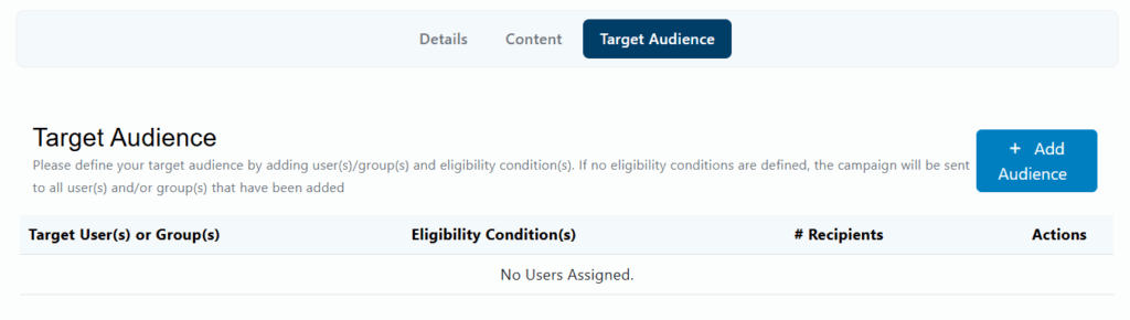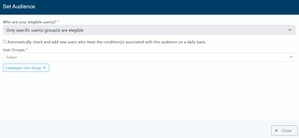 - Only specific user(s) group(s) are elegible: The campaign will be sent to all users and can be accessed by selected user groups.