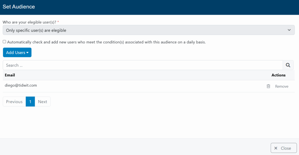 - Only specific user(s) are elegible: The campaign will be sent to all users and can be accessed by selected users.
