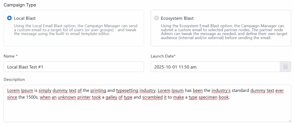 - Campaign Type: Choose Local Blast from the drop-down menu (this option allows you to send a custom email to a target list of users (or user groups) – and tweak the message using the built-in email template editor.).