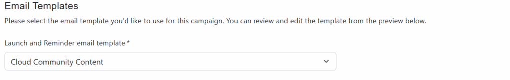 In the drop-down menus select the templates for the Launch email and for the Reminder email. Then click on Save. Email templates can be created and edited separately using the “Email Templates” application (refer to the corresponding user guide).