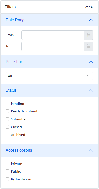 - Clear All: Located at the top right of the filter header, this function instantly resets all selected criteria to the default state.
