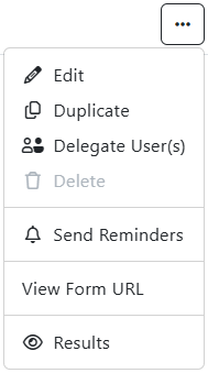 At the three dots you have available different options, you can edit the information of the selected form/survey, duplicate, delegate users, delete (If the form/survey has not yet been published), send reminders to specific users, view results and view form/survey Url.