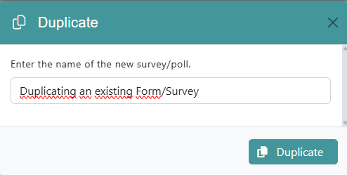 This allows you to duplicate the entire original structure of any selected form or survey. A new row will be created in the table and you will need to define a new form/survey name.