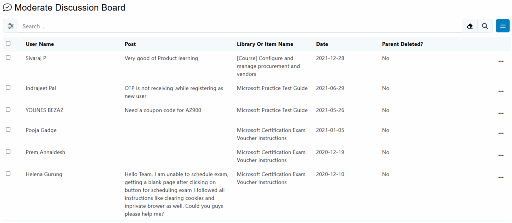 The “Moderate discussions and comments” section allows platform administrators or moderators to manage user-generated posts in different libraries, content items, or integrated learning paths. This centralized interface ensures that all discussion activity related to published learning resources can be reviewed and moderated efficiently.
