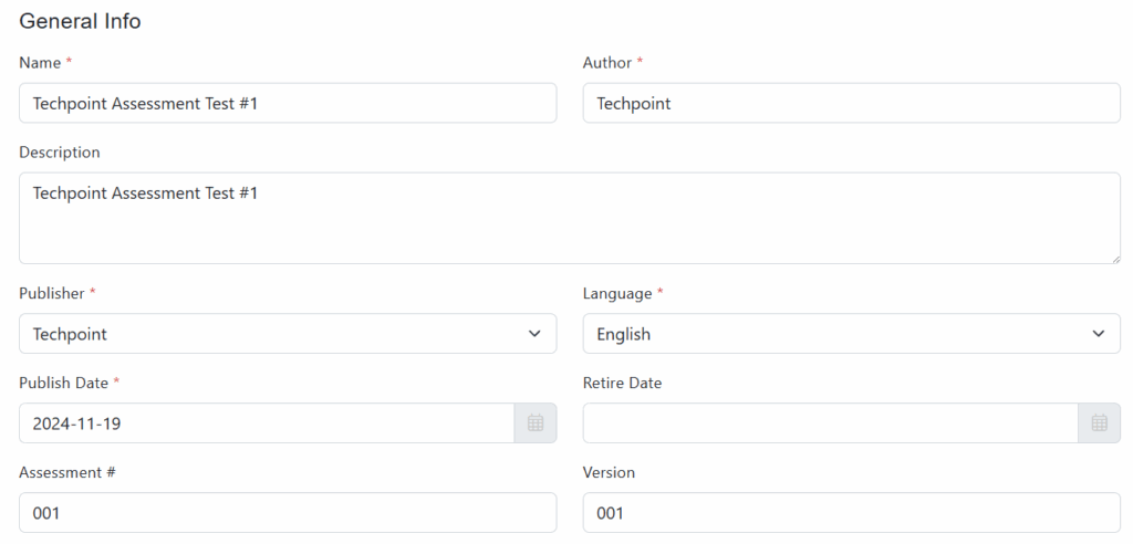 - Seleccione una Fecha de Actualización/Retiro para la nueva evaluación, si desea desactivarla en una fecha específica. (Opcional).