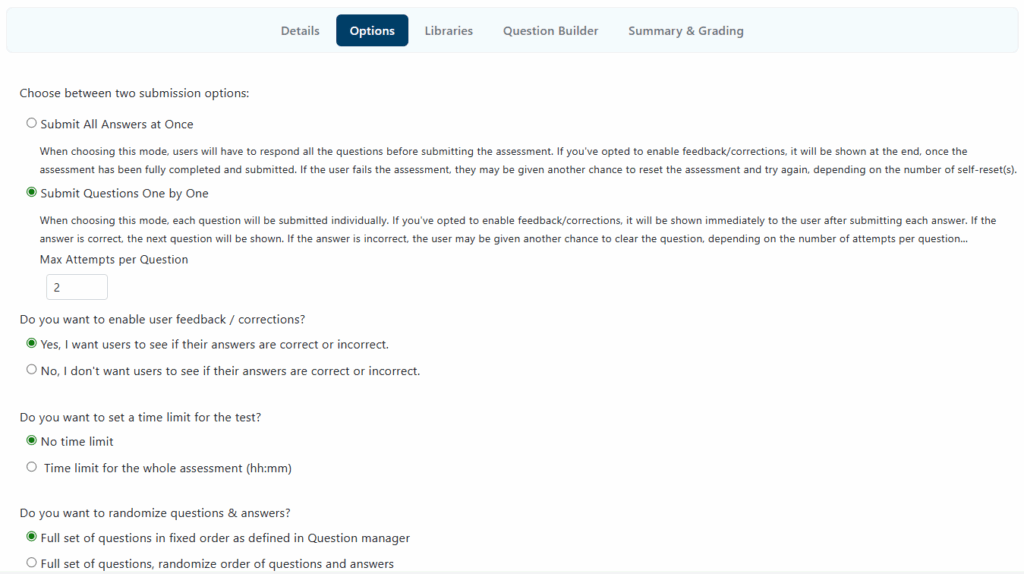 - If you select Submit All Answers at Once, users will have to answer all questions first and feedback (if enabled) will be shown at the end. On the Max Number of Self-Reset, write the number of times users can reset the assessment by themselves. After reaching this number, they will have to submit a customer support ticket with the TIDWIT team to ask for an Assessment Reset.