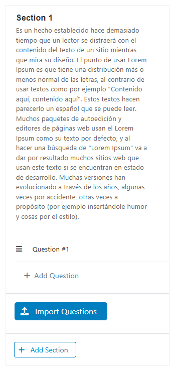 Escriba una introducción para la sección que está creando y luego haga clic en el botón + Agregar Pregunta. Aparecerá un nuevo cuadro donde puede ingresar una nueva pregunta.
