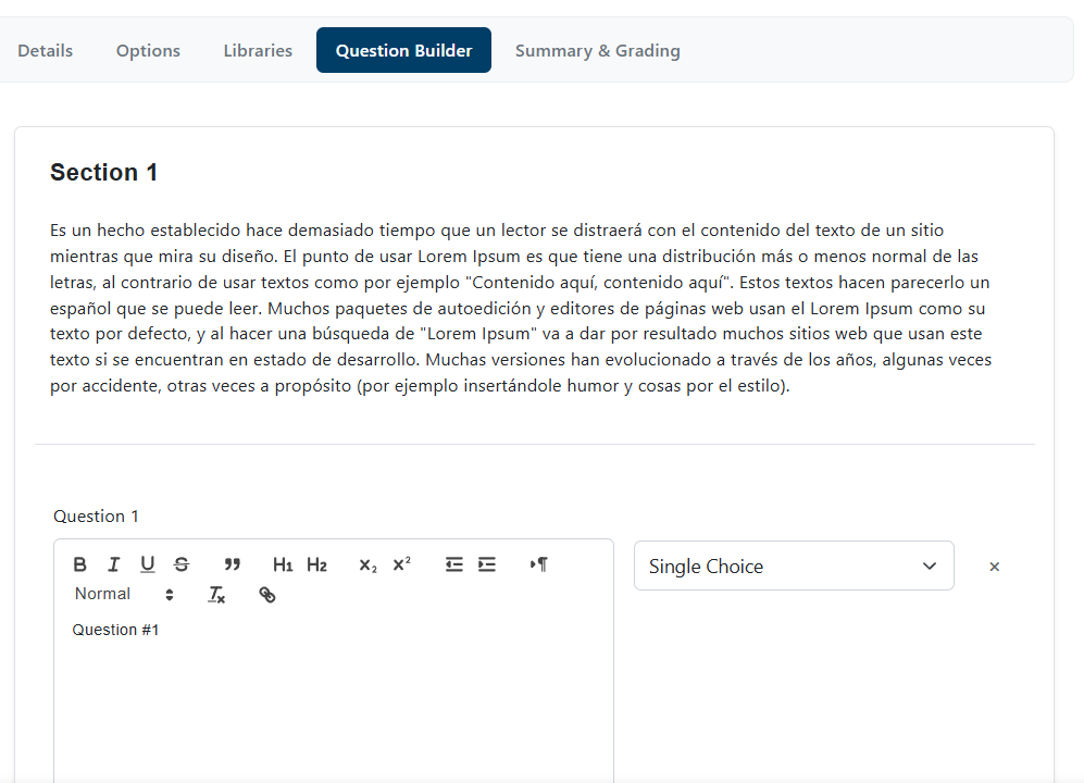 Puede agregar múltiples secciones y preguntas. Si desea cambiar la posición de una sección o pregunta en la evaluación, haga clic en el botón de flechas para moverla una posición arriba o una posición abajo.
