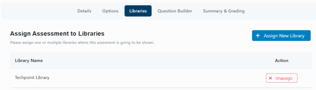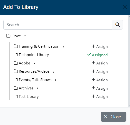 Seleccione y agregue las bibliotecas asignadas haciendo clic en el botón Agregar. La evaluación se añadirá inmediatamente a la lista de bibliotecas asignadas. Cierre esa ventana para ver cuáles bibliotecas ha seleccionado.