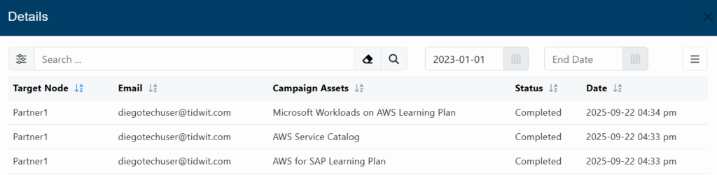 Debajo del gráfico, verás la sección de Detalles, donde puedes utilizar filtros como Rango de Fechas, Estado, Tipo de Activo (Elementos de Contenido, Rutas de Aprendizaje, Paquetes) para encontrar información específica de la campaña actual.